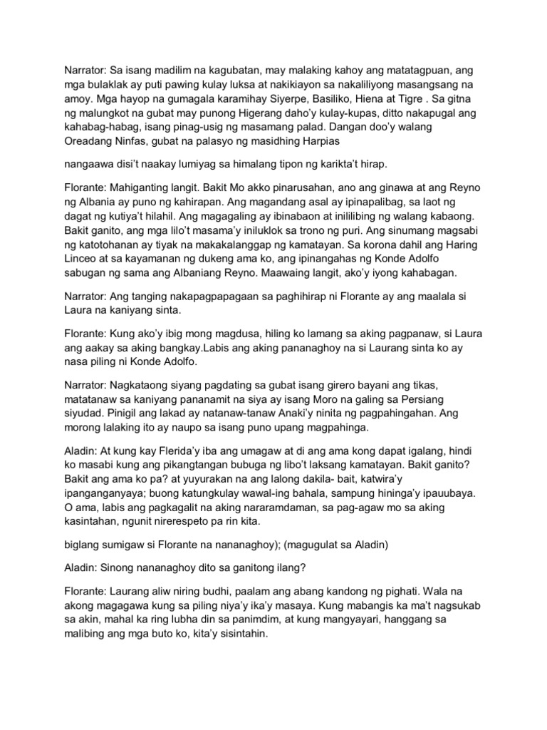 Dumating ba si aladin sa kagubatan. FLORANTE AT LAURA SCRIPT NARRATOR. Dahil madilim na hinatid ni Aladin si Florante sa pasukan ng kagubatan kung saan siya binantayan buong gabi hanggang sa sila ay nakatulog. Kinuwento ni Florante ang kanyang buhay.